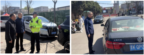 针对路边车辆违停影响交通情况,我院与交警一大队队员联合疏导校园周边交通。保卫部工作人员引导车辆即停即走,交警对违规停放的车辆进行拍照取证,下达违法停车告知单,同时劝导车辆驶离现场。