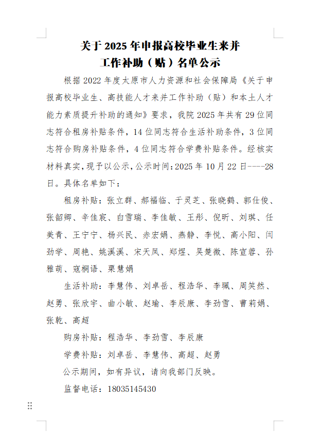 关于2025年申报高校毕业生来并工作补助(贴)名单公示