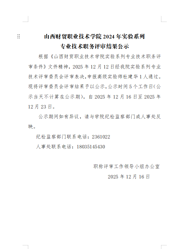 山西财贸职业技术学院2024年实验系列专业技术职务评审结果公示