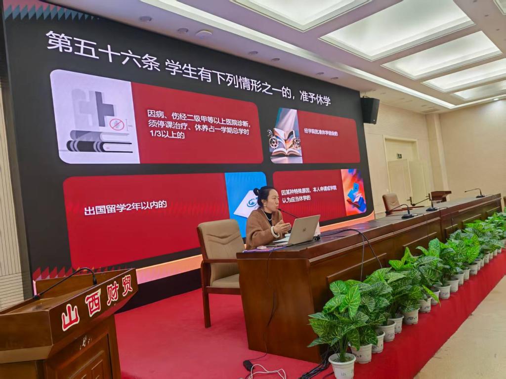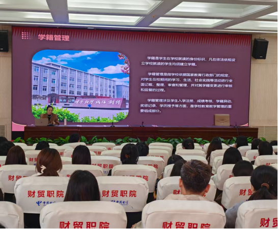 为深入贯彻依法治校理念,以法治思维引领学籍管理实践,我院依据《普通高等学校学生管理规定》(教育部41号令),经山西省教育厅及法务部审核,新修订了《山西财贸职业技术学院学生学籍管理办法(试行)》和《山西财贸职业技术学院学生转专业管理办法(试行)》。3月13日,教务部联合学生部组织开展学籍管理专项培训,旨在提升学籍管理队伍的专业素养与服务能力,推动学籍管理工作的法治化、规范化、精细化建设,各系党总支副书记、副主任、全体辅导员、学习委员及学生代表等百余人参会,培训由教务部副部长赵艳丽主讲。