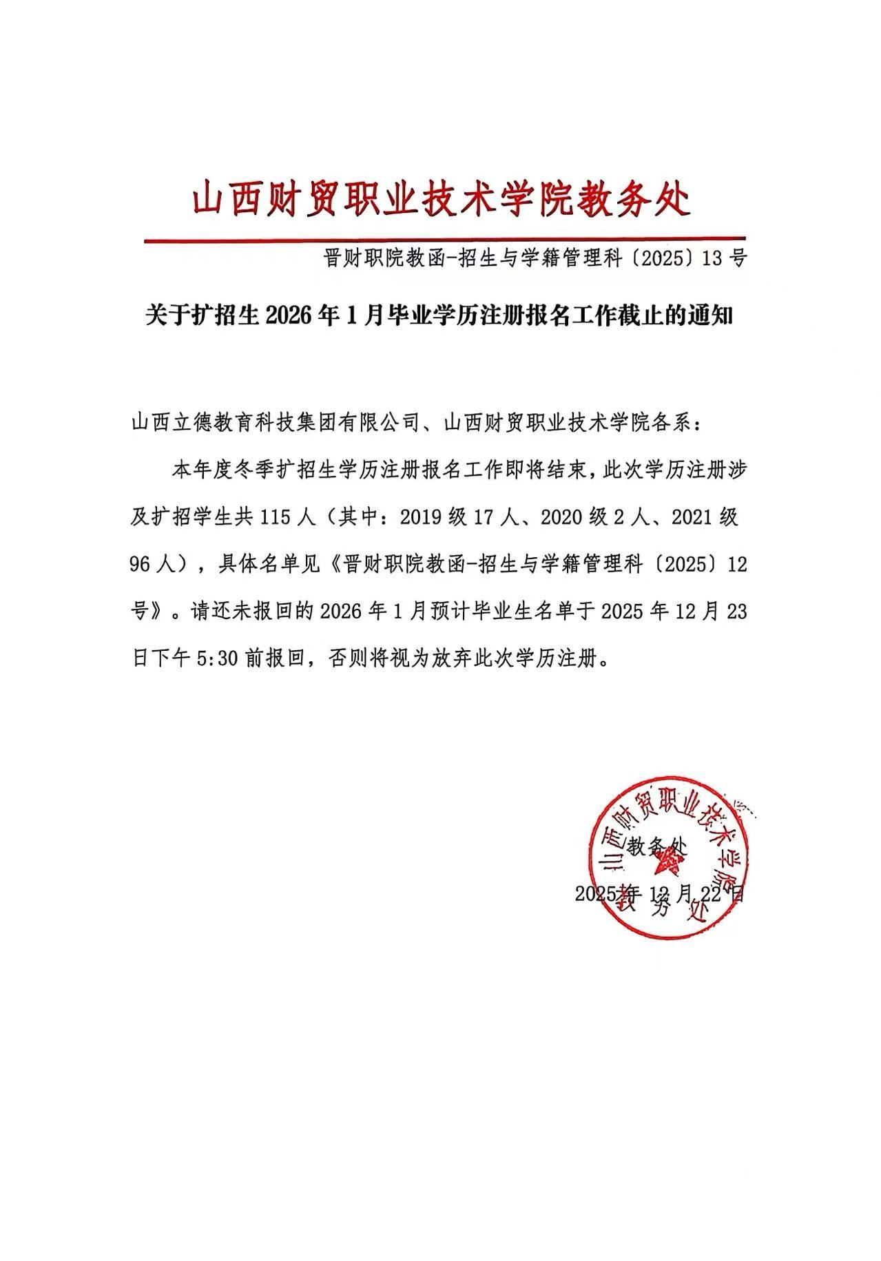 关于扩招生2026年1月毕业学历注册报名工作截止的通知