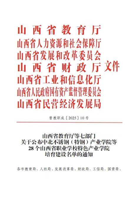 2025年11月3日,山西省教育厅等七部门联合印发《关于公布中北不锈钢(特钢)产业学院等28个山西省职业学校特色产业学院培育建设名单的通知》(晋教职成〔2025〕10号),山西财贸职业技术学院牵头建设的“浑源恒山黄芪文旅康养产业学院”成功入选,标志着学院在深化产教融合、服务地方产业发展方面迈出关键步伐。