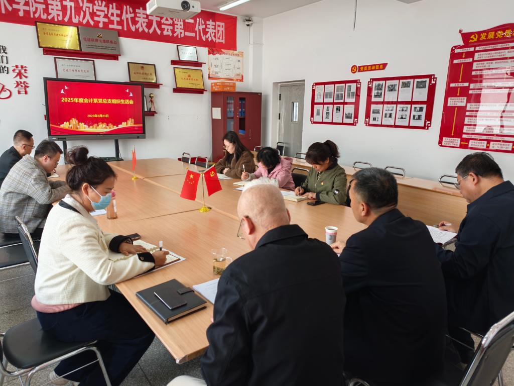 3月23日下午2:30,会计系党总支2025年度组织生活会在系党建活动室召开。学院党委副书记、院长弓志刚,组织部部长葛建军到会指导。会计系党政班子、总支委员参加会议,专职组织员列席会议。会议由系党总支书记吴艳东主持。