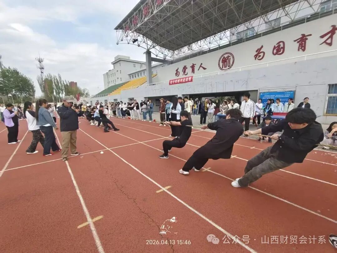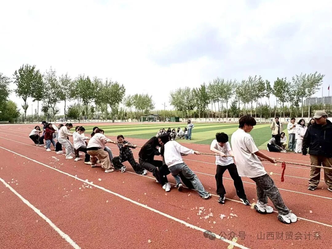 为丰富同学们的校园文化生活,增强班级凝聚力与团队协作精神,4月13日下午,会计系拔河比赛火热开赛。 赛场上,每支队伍都斗志昂扬,参赛选手们双脚奋力蹬地、身体后仰,双手紧紧攥住麻绳,全神贯注、全力以赴。双方队员齐心协力、咬紧牙关,将团结与拼搏展现得淋漓尽致。