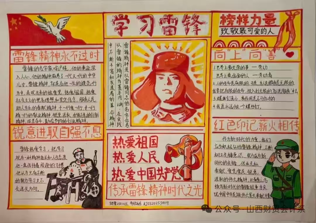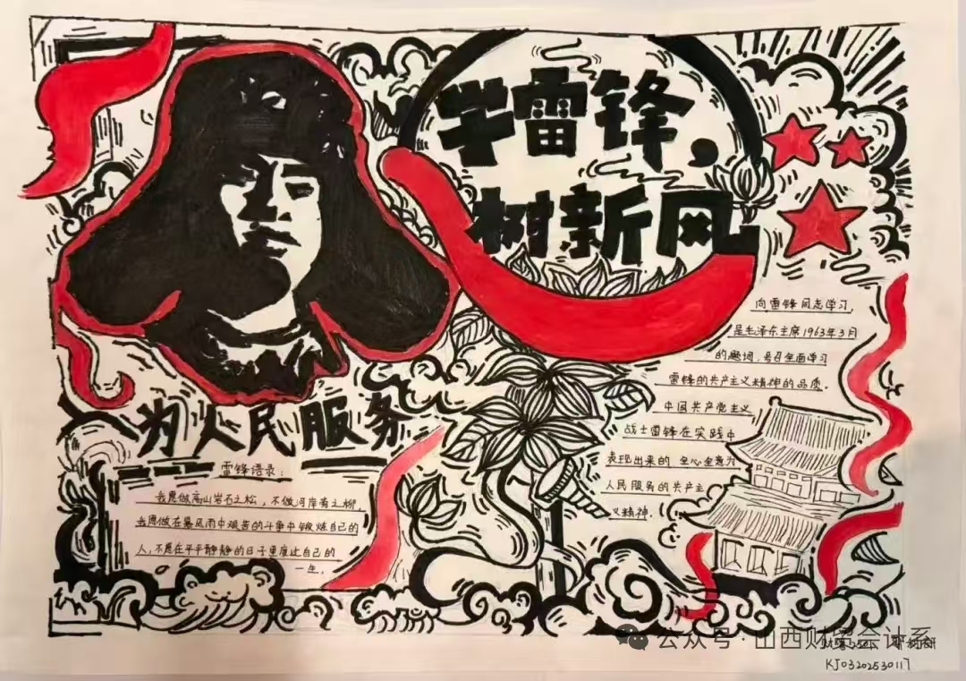 同时,会计系同步开展“绘雷锋精神 传时代新风”主题手抄报活动和“传承雷锋精神 争做时代新人”主题短视频征集活动,面向全系学生征集优秀作品。同学们紧扣助人为乐、无私奉献、爱岗敬业等精神内涵,用镜头记录身边雷锋事迹,用画笔描绘雷锋故事,以多元形式传递正能量,展现新时代青年的责任与担当。