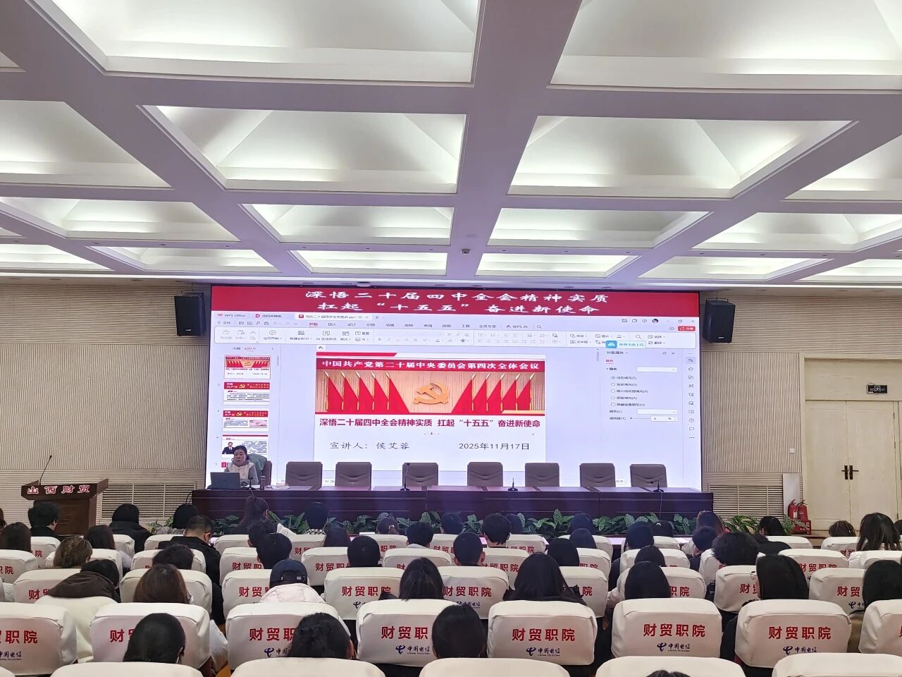 为深入贯彻落实党的二十届四中全会精神,引导青年学子明晰时代使命,11月17日下午,院团委特邀思政部侯艾蓉老师,在砺志楼大报告厅开展“深悟二十届四中全会精神实质 扛起‘十五五’奋进新使命”专题讲座。院“青马工程”全体学员及部分学生干部共同参与本次学习。