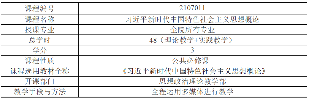 《习近平新时代中国特色社会主义思想概论》是一门思想政治理论课,是中宣部和教育部规定的高校思想政治理论教育的核心课程。学时为48学时,3学分。本课程通过系统讲授习近平新时代中国特色社会主义思想的时代背景、核心要义、精神实质、丰富内涵、重大意义、历史地位和实践要求,结合习近平新时代中国特色社会主义思想在山西的生动实践,帮助学生全面认识其时代意义、理论意义、实践意义、世界意义,深刻把握其中贯穿的马克思主义立场观点方法,进一步增强“四个意识”,坚定“四个自信”,坚决做到“两个维护”,努力成长为担当民族复兴大任的时代新人。