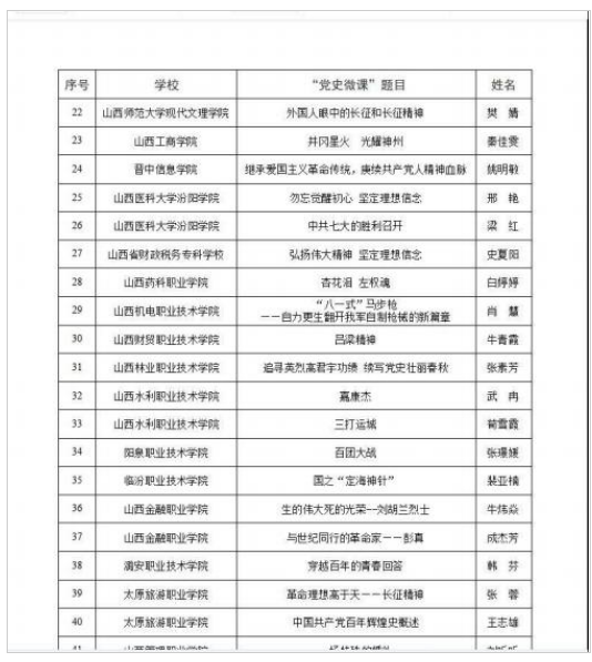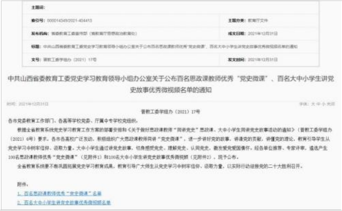 经过层层选拔,思政部选送的两项作品分别入选山西省“100名思政课教师优秀‘党史微课’”和“100名大中小学生讲党史故事优秀微视频”。