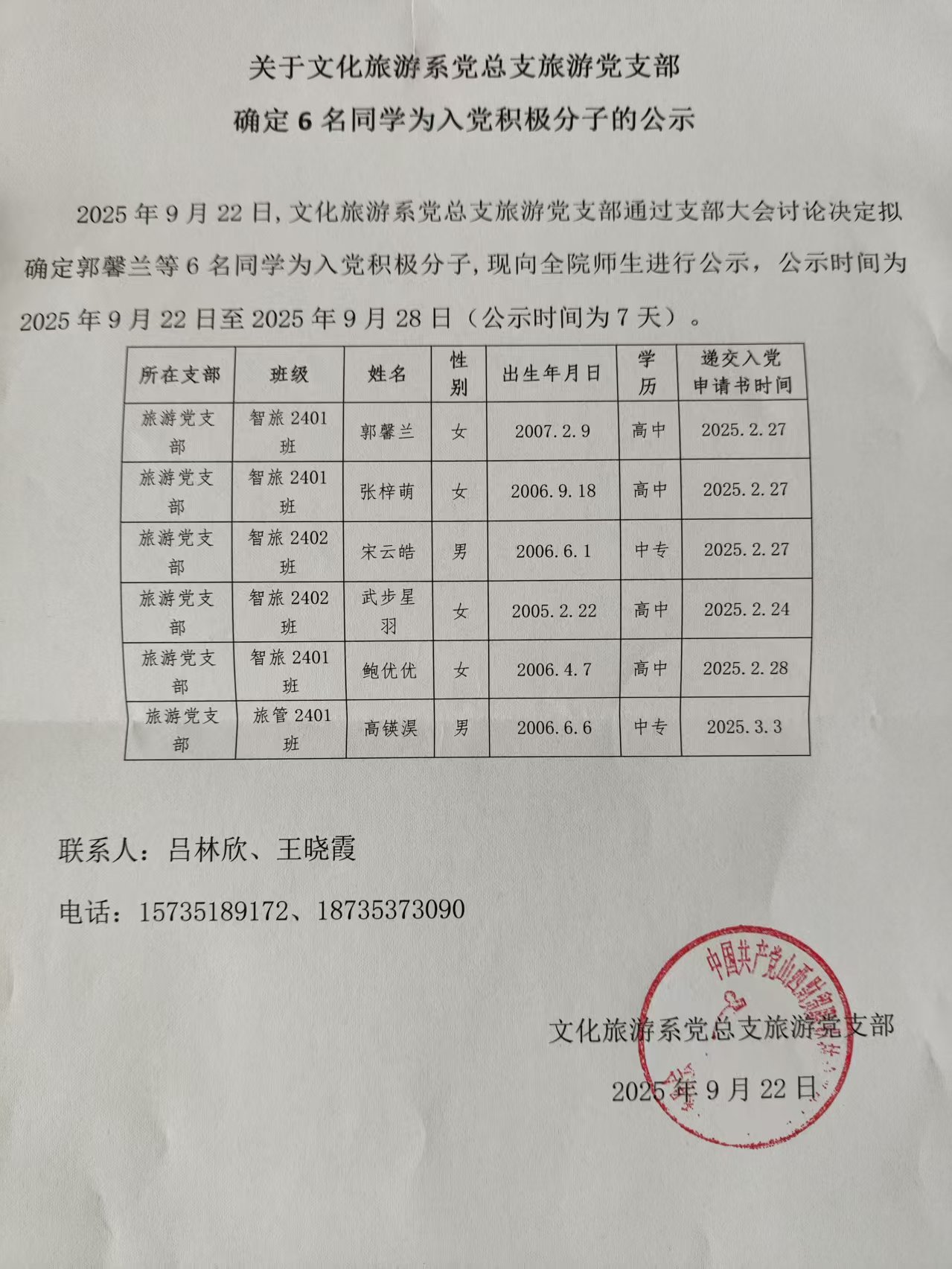 关于文化旅游系党总支旅游党支部确定6名同学为入党积极分子的公示