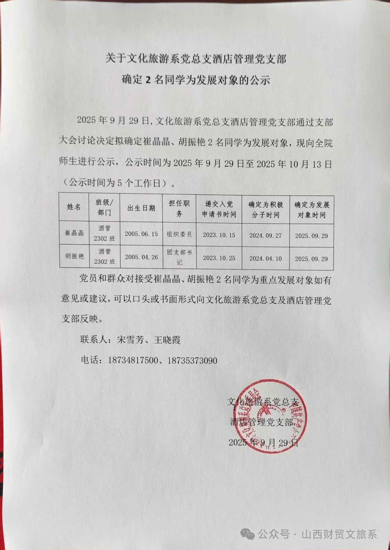 关于文化旅游系党总支酒店管理党支部确定2名同学为发展对象的公示