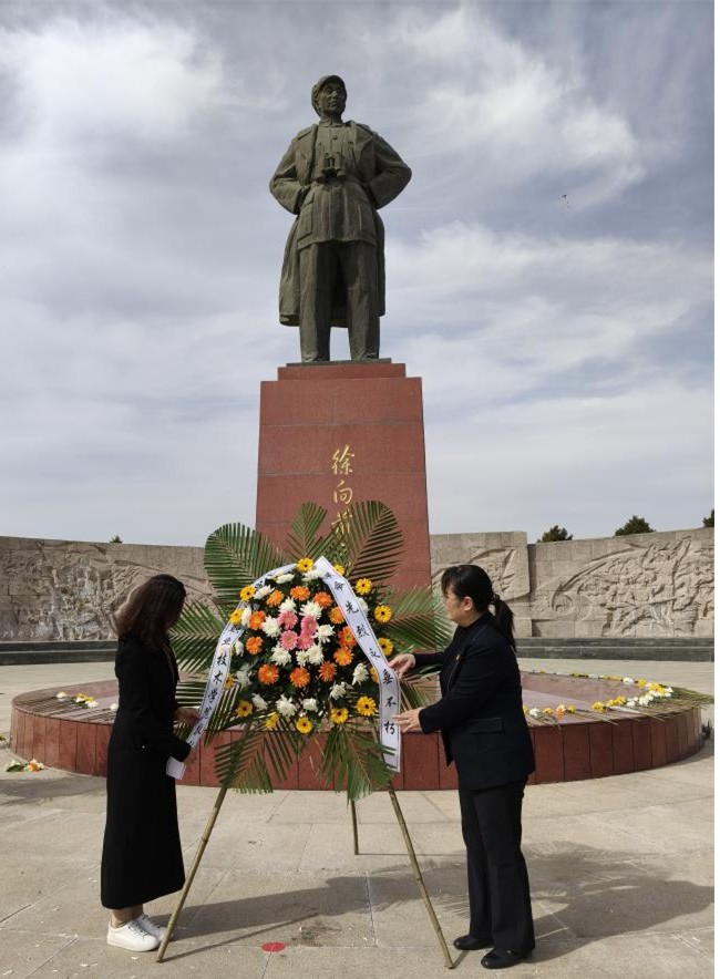 在敬献花篮环节,学生代表缓步上前,向烈士纪念碑敬献花篮。文化旅游系党总支书记马娟、系主任王雪娟上前整理挽联,全体人员肃立注目,向英烈致以最崇高的敬意。