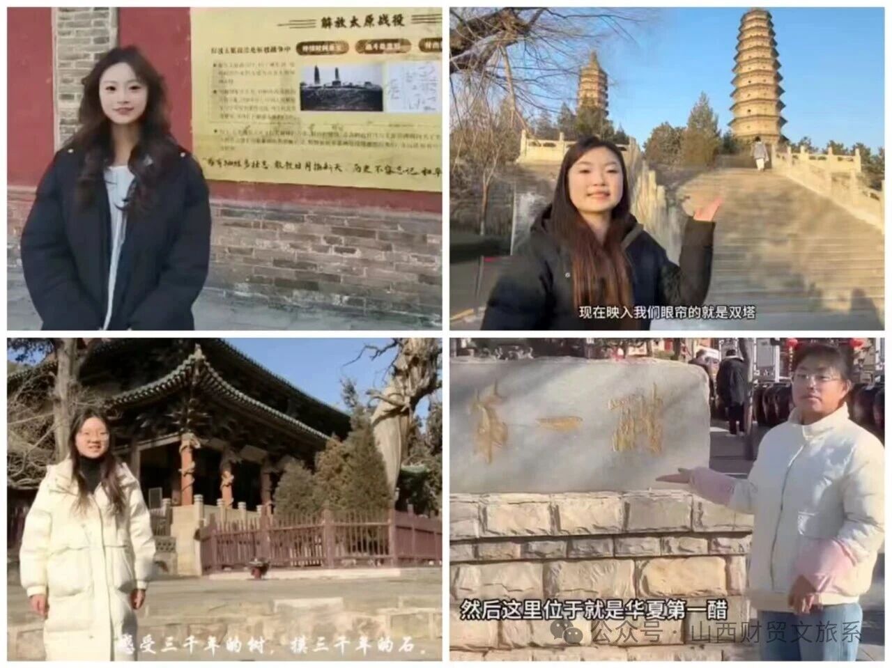 实践周期间,学生还自主开展“太原自由行旅游VLOG创作”活动。他们以出镜讲解的方式记录游览历程,在亲身实践中深入体悟太原的历史文化与山水风光,进一步将所学知识转化为实践能力。