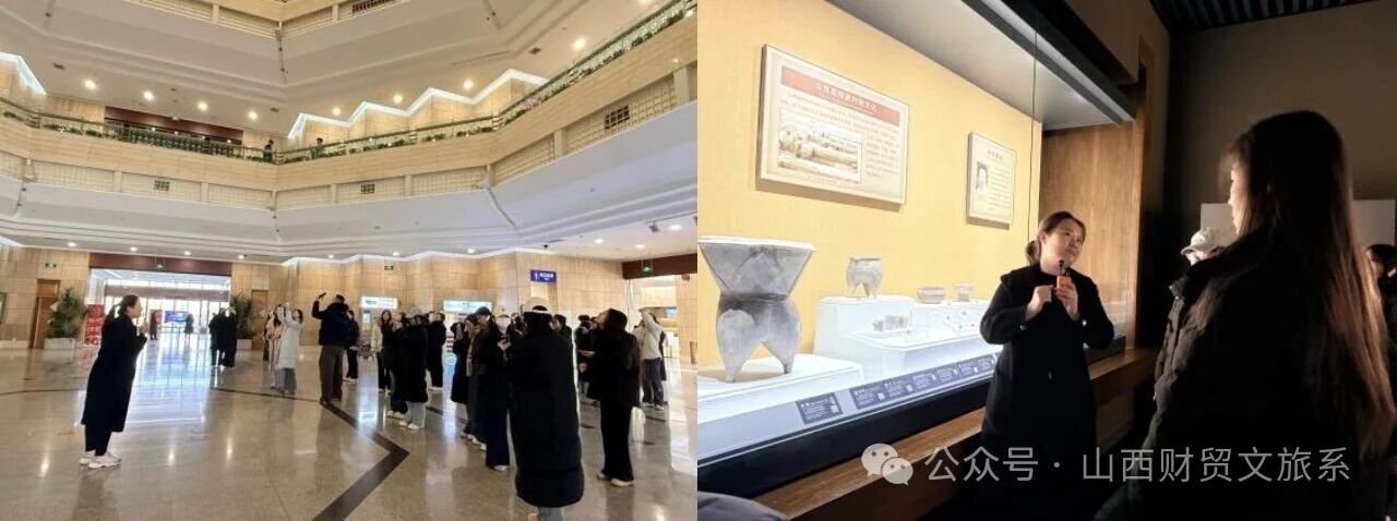 第二天,旅游管理专业全体学生前往山西博物院开展特色参观学习活动。从登上大巴车起,学生便置身于真实的导游带团情境中,在指导教师与优秀校友王昕越的带领下,先后参观了七个专题展厅。王昕越重点讲解了文明摇篮、夏商踪迹、晋国霸业、天下晋商等内容,让学生近距离感受山西厚重历史底蕴,深刻领会“这里最早叫中国”的内涵,既增强了历史自豪感,也为今后旅游带团工作积累了宝贵的实践经验与认知。