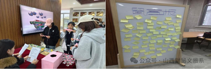 开幕式结束后,文化旅游系师生移步展厅观展。旅游协会志愿讲解员为大家详细解读展品背后的技艺密码,生动阐释其中蕴含的古代科技智慧。在讲解员的引导下,大家凝神细观每一件凝聚着千年智慧的展品,感受独特的晋韵风华与三晋精魂。展览现场设有寓教于乐的有奖竞猜环节,同学们踊跃参与,在轻松互动中解码了传统工艺背后蕴含的古老智慧。留言板上,同学们执笔抒怀,“匠心传承,不负韶华”等真挚感悟跃然纸上,展现了新时代文旅学子对传统文化和工匠精神的深刻领悟和时代担当。