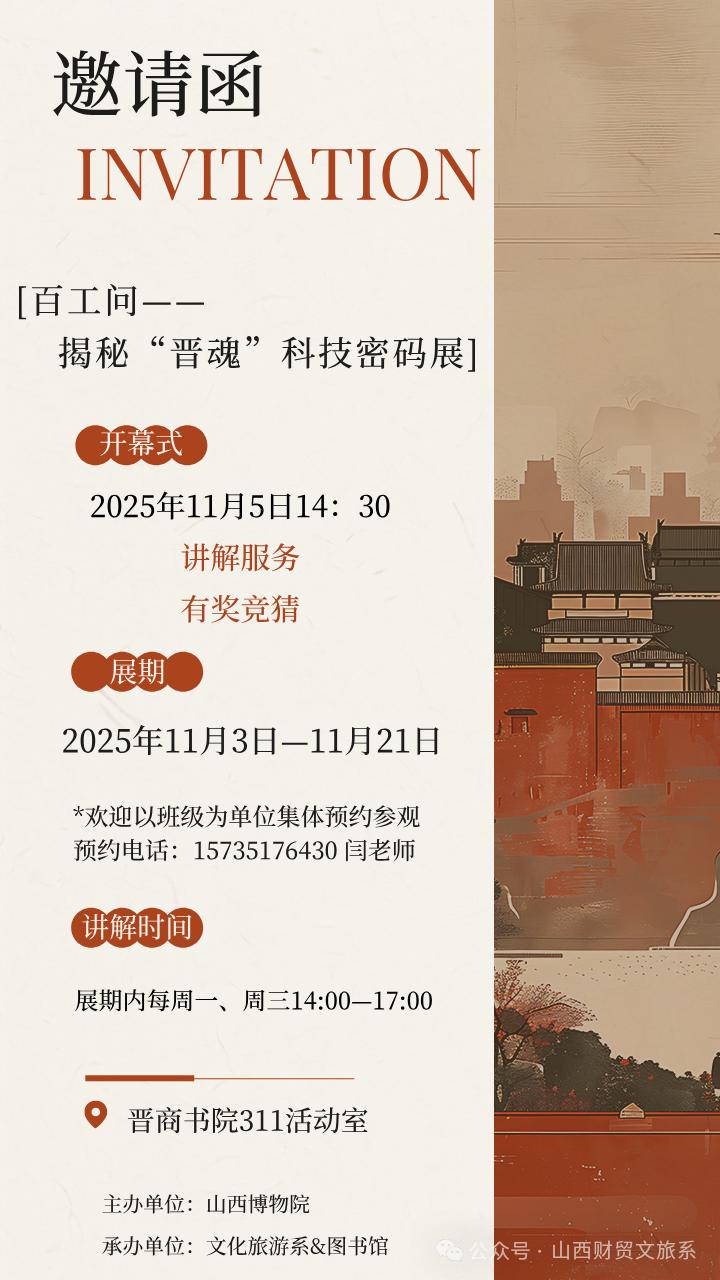 各位老师、同学好: 由文化旅游系与图书馆联合承办的山西博物院“百工问——揭秘‘晋魂’科技密码展”将于11月3日至21日在晋商书院311活动室开展。开幕式定于11月5日14:30举行,展期内每周一、三下午设有讲解服务及有奖竞猜活动。欢迎各班级集体预约参观,联系闫老师15735176430。诚邀全院师生共赴这场文化科技之旅,领略晋商智慧与晋魂魅力!