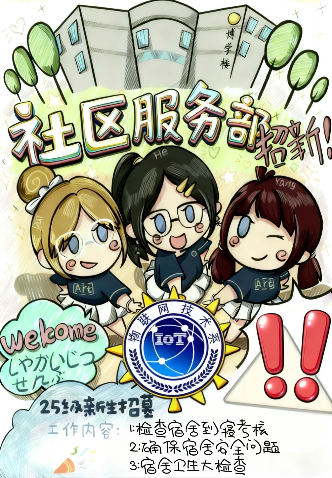 如果你擅长用文字捕捉活动亮点,让每一场精彩都能被清晰铭记;如果你喜欢用设计打破常规,让校园的宣传载体都充满创意巧思;如果你愿意用书画表达态度,让物联网技术系的形象更具艺术感染力,那么宣传部就是你的理想舞台。