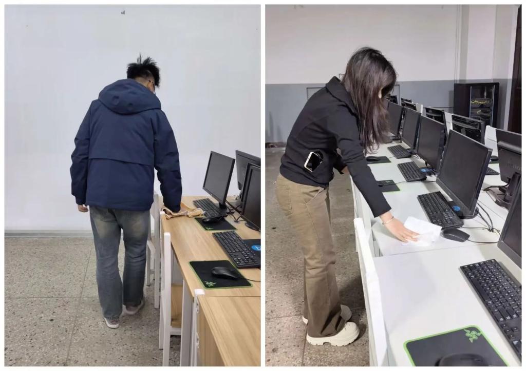 从桌面到地面,从设备外观到接口细节,大家不放过任何一处卫生死角。经过数小时的辛勤付出,机房面貌焕然一新,地面光洁、设备整齐,学习氛围更加清爽宜人。同学们在劳动中真切体会到“小事见担当”的道理,责任感与团队协作意识也在实践中得到进一步提升。