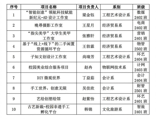 遴选过程中,评审组围绕项目的“创新性与专业性”、“项目基础与计划”等多个维度进行综合评议。经过严格筛选与深度讨论,最终共有10个项目获得入驻资格。入选项目涵盖美甲美睫、篆刻工艺、二手交易、非遗文创等多个领域,充分展现了我院学生跨专业、多层次的创新创业能力。