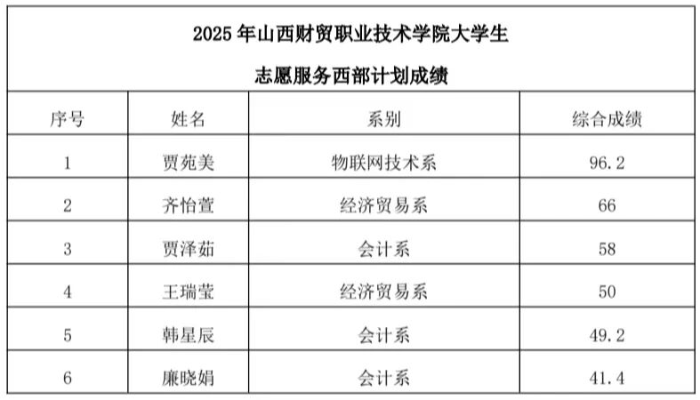 为全面贯彻落实党的二十大、二十届三中全会精神,贯彻落实习近平总书记关于青年工作的重要思想,围绕党中央、国务院关于推进乡村全面振兴的战略部署和做好高校毕业生等重点群体就业工作的相关要求,进一步引导和鼓励高校毕业生到西部去、到基层去,根据《2025一2026年度大学生志愿服务西部计划实施方案》相关要求,结合我院实际,院团委(西部计划项目办)自2025年2月底面向全院应届毕业生开展大学生志愿服务西部计划志愿者招募工作,经报名初审、系部审核、院团委复审后,进行考核测试。现将选拔结果公示如下: